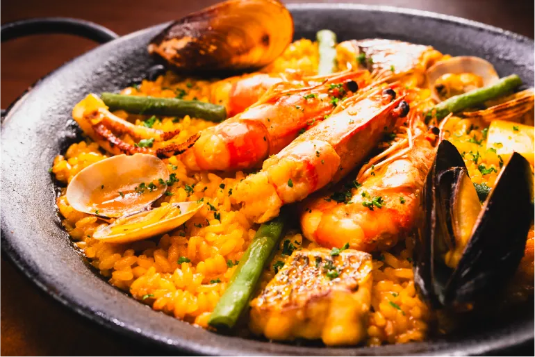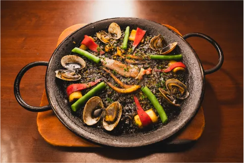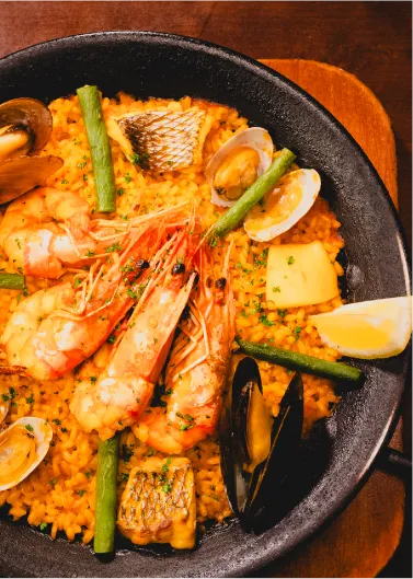 ゆっくりと炊き上げることで魚介の旨みを閉じ込めた名物のパエリア、時を重ねた旨みが広がる産地直送の希少なイベリコ。